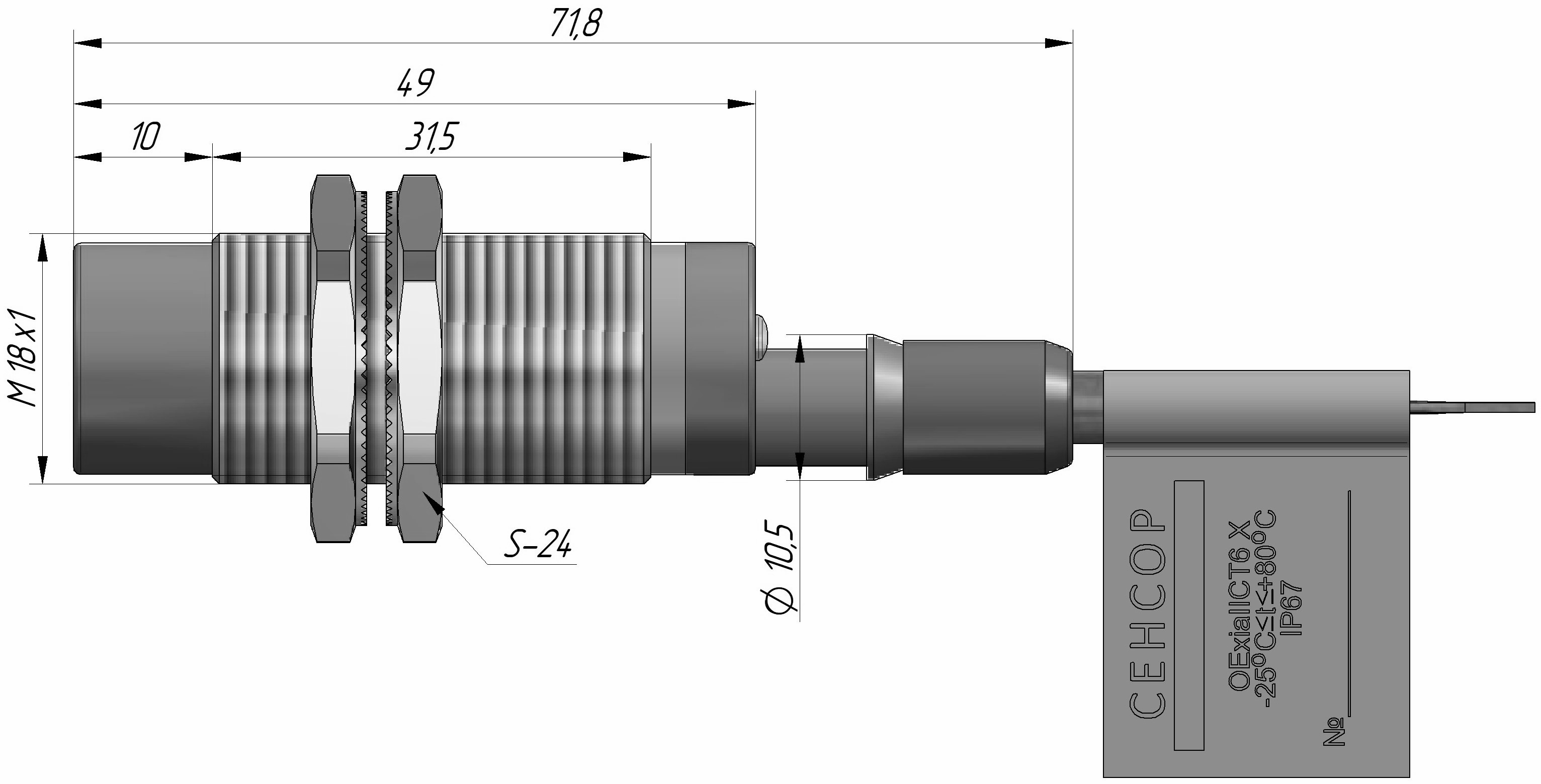 Индуктивный датчик взрывозащищенный ДВИ-М18-44С-2130-Х в цилиндрическом корпусе из никелированной латуни Ø18 мм, стандарт NAMUR, спроектирован с видом взрывозащиты искробезопасная электрическая цепь «ia» способен работать при низких значениях напряжения и тока.
