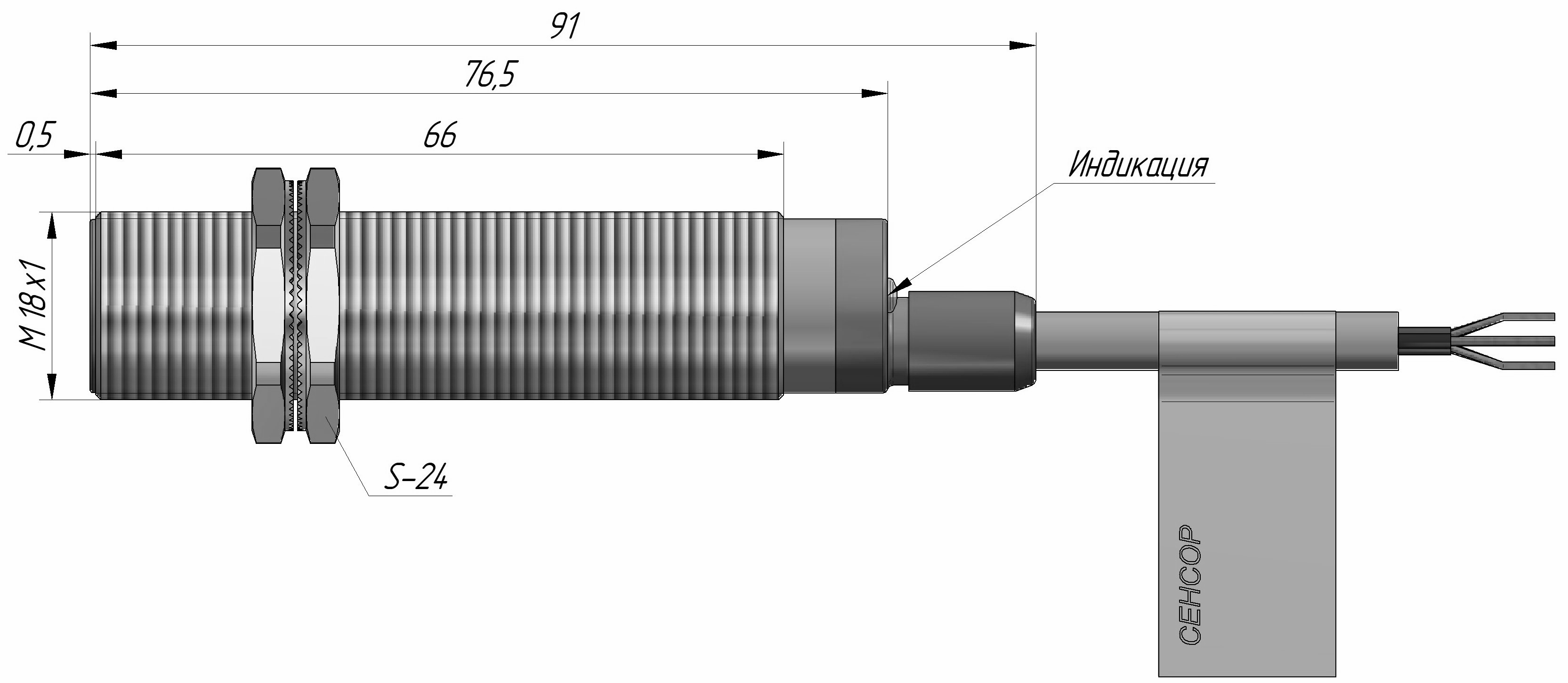 Индуктивный датчик ВБИ-М18-76В-1351-Л.51 в цилиндрическом корпусе из никелированной латуни Ø18 мм, в общепромышленном исполнении.