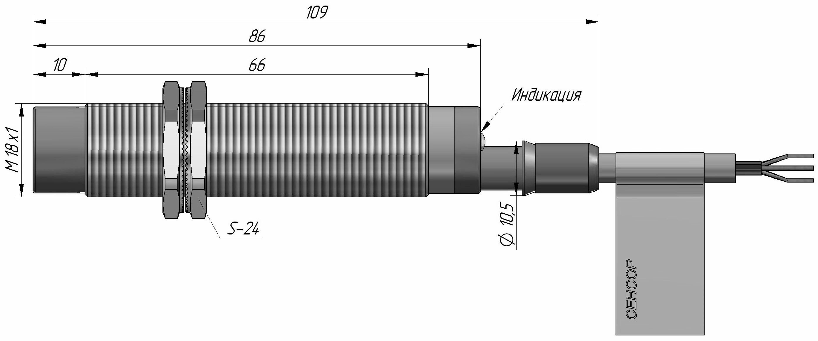 Индуктивный датчик ВБИ-М18-86С-2111-С.18 в цилиндрическом корпусе из никелированной латуни Ø18 мм, в общепромышленном исполнении.
