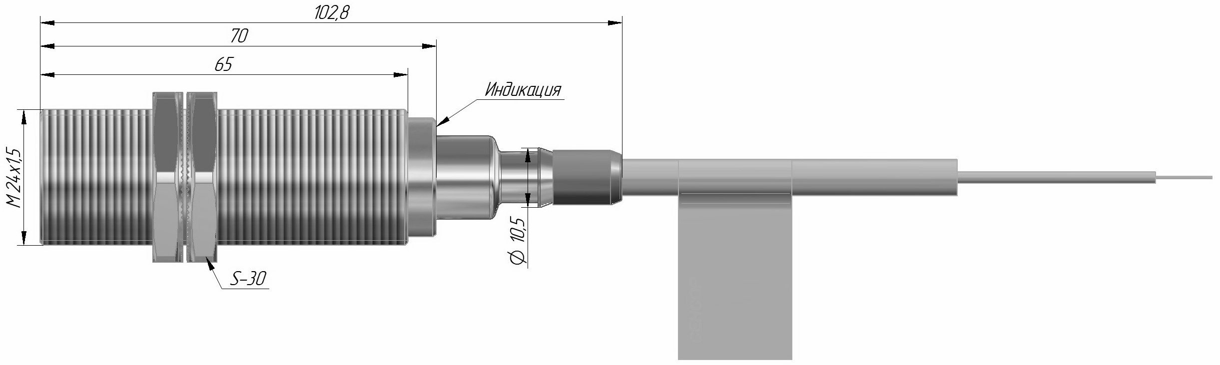 Индуктивный датчик ВБИ-М24-72С-1113-С.9 в цилиндрическом корпусе из никелированной латуни Ø24 мм, в общепромышленном низкотемпературном исполнении.
