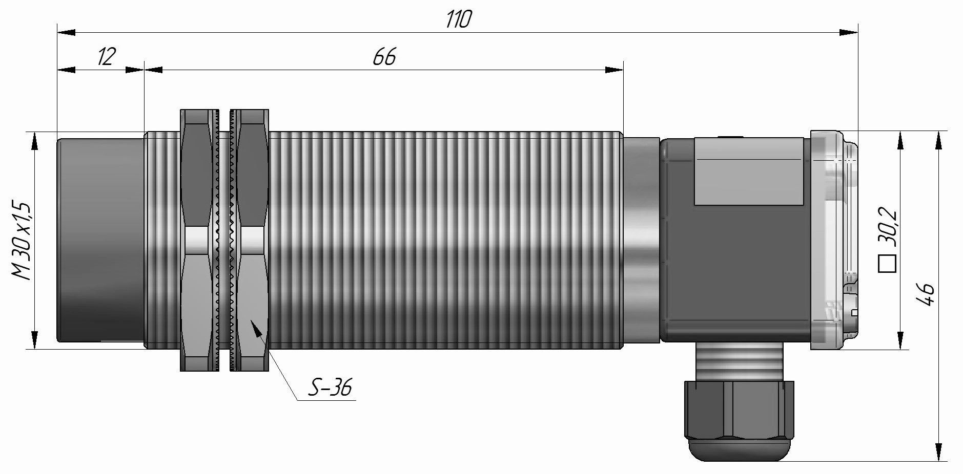 Индуктивный датчик ВБИ-М30-91К-2251-Л в цилиндрическом корпусе из никелированной латуни Ø30 мм, в общепромышленном исполнении.