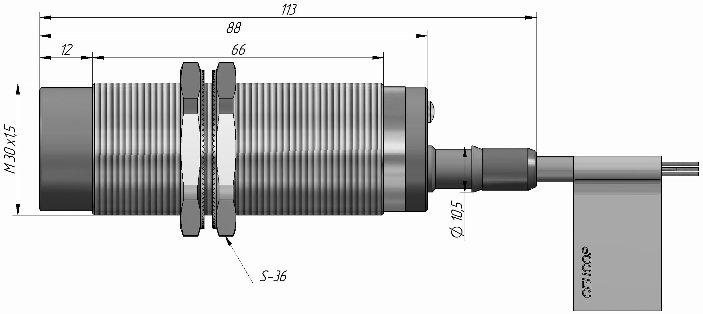 Индуктивный датчик ВБИ-М30-91С-2352-Л.51 в цилиндрическом корпусе из никелированной латуни Ø30 мм, в общепромышленном исполнении.