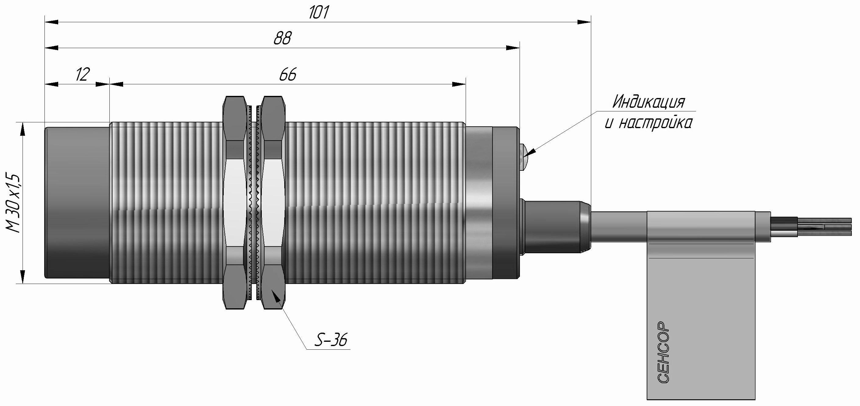Индуктивный датчик ВБИ-М30-65В-2123-СА.51 в цилиндрическом корпусе из никелированной латуни Ø30 мм, в общепромышленном исполнении.
